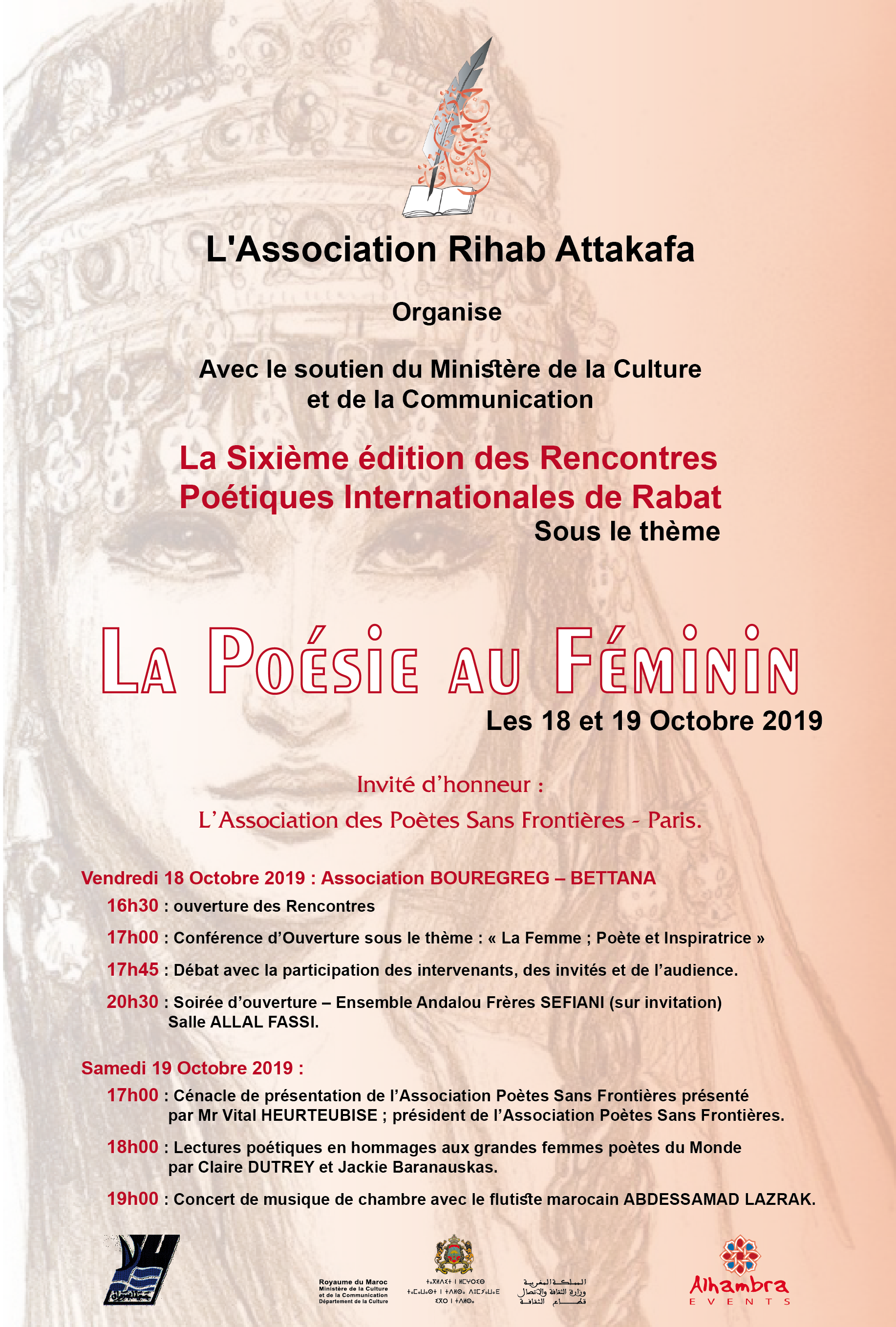 Après le franc succès rencontré lors des éditions précédentes, l’Association RIHAB ATTAKAFA organise, avec le soutien du Ministère de la Culture, et en partenariat avec l’Alhambra Events la sixième édition des Rencontres Poétiques Internationales de Rabat sous le thème : « La Poésie Au Féminin » Avec la participation d’imminents poètes marocains et européens qui se sont regroupés autour de la poésie pour créer un véritable pont d’échange poétique et culturel d’une part et d’autre de la méditerranée. Le programme des rencontres se présentera comme suit :
