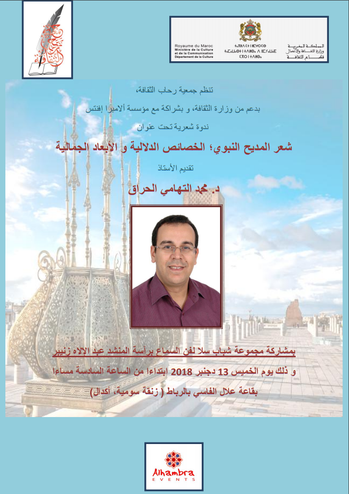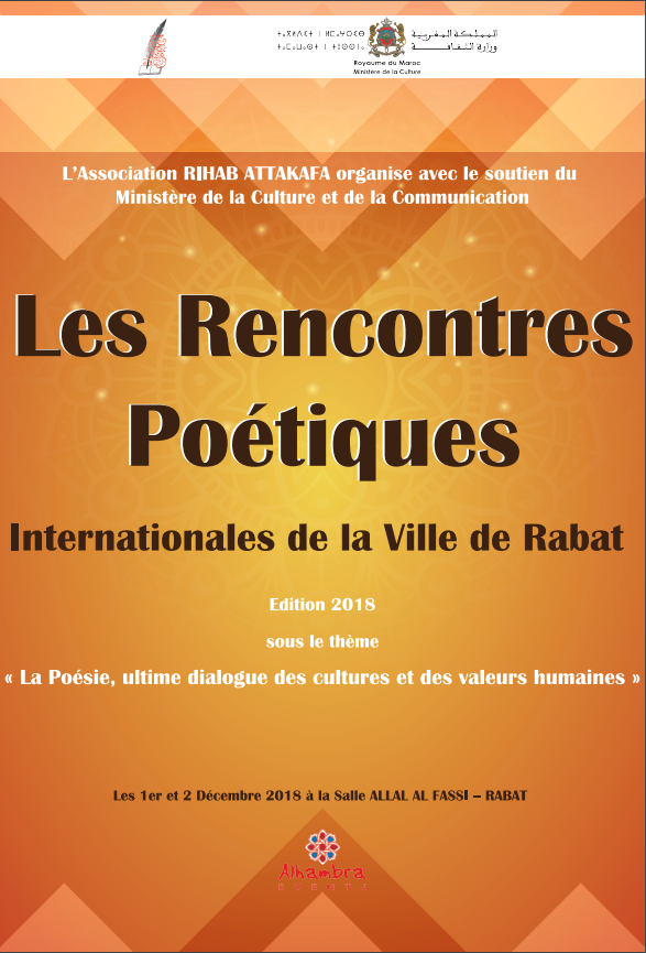 L’Alhambra Events et l’Association RIHAB ATTAKAFA, organisent avec l soutien du Ministère de la Culture, l’édition 2018 des Rencontres Poétiques Internationales de Rabat les 1er et 02 Décembre 2018 Détails